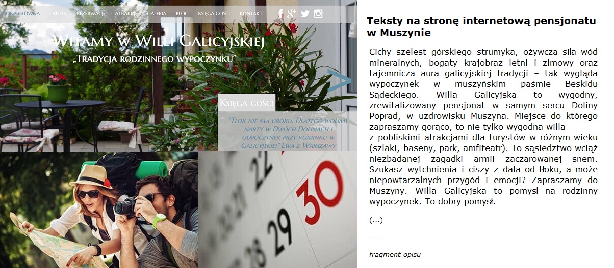 „Cichy szelest górskiego strumyka, ożywcza siła wód mineralnych, bogaty krajobraz letni i zimowy oraz tajemnicza aura galicyjskiej tradycji – tak wygląda wypoczynek w muszyńskim paśmie Beskidu Sądeckiego. Willa Galicyjska to wygodny, zrewitalizowany …”